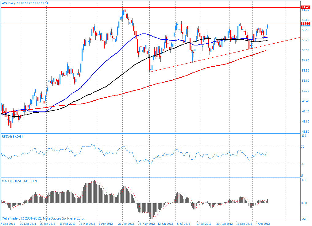 Акции AXP приблизились в важному сопротивлению $59,30 (область максимумов сентября и октября).