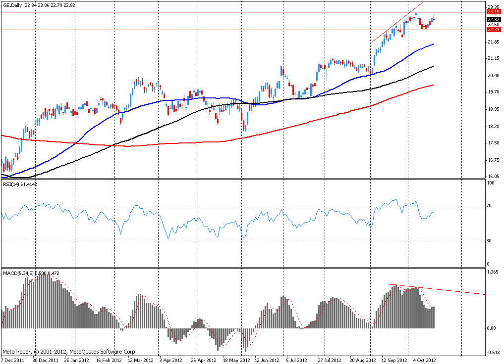 Акции GE c начала года выросли более чем на 31%, достигнув в начале октября текущего года 4-х летнего максимума, который является ближайшим сопротивлением (область $23.15).