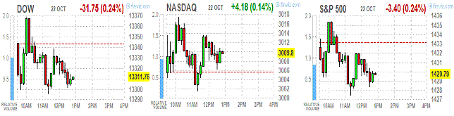 Большинство компонентов индекса DOW находятся в минусе. Большеостальных выросли в цене акции Caterpillar (CAT, +1.34%), не смотря на снижение прогнозов. Больше остальных снизились акции General Electric (GE, -3.40%).