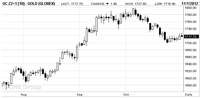 Стоимость декабрьского фьючерса на золото на COMEX сегодня выросла до 1717.70 доллара за унцию.