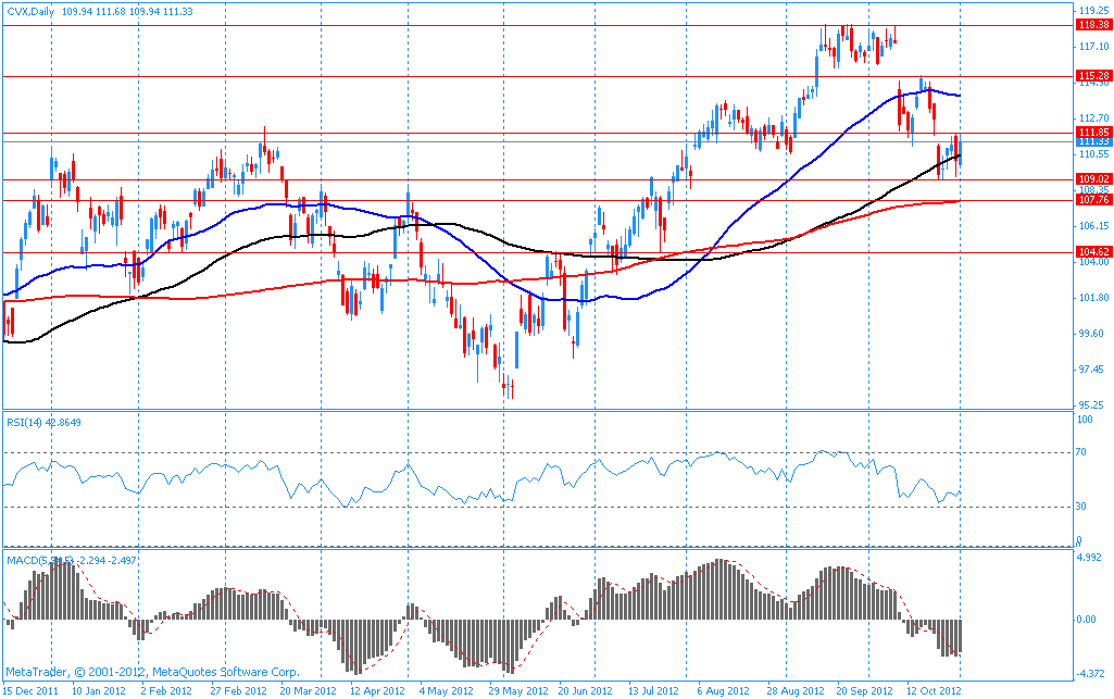 Ближайшей поддержкой для акций CVX является область минимума октября $109.00. Ниже потери могут увеличится до МА(200) для D1, которая ограничивает снижение акций у области $107.80.