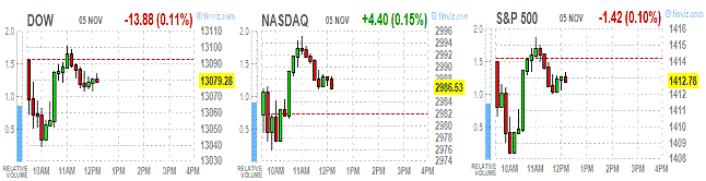 Основные фондовые индексы США торгуются смешано. В преддверии завтрашних выборов инвестора предпочитают оставаться вне рынка, на этом фоне объем торгов сегодня сниженный.