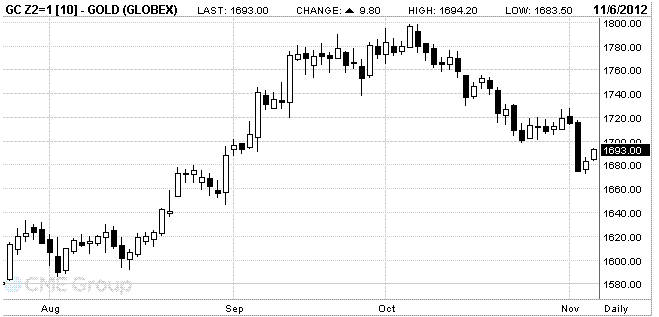 Сегодняшние данные также показали, что импортеры золота в Индии оставались в стороне в ожидании итогов выборов в США. Отметим, что импорт золота в Индии может упасть до 550 тонн в следующем году, по сравнению с 967 тонн в 2011 году, так как высокая инфляция и цены негативно влияют на уровень располагаемых доходов потребителей.