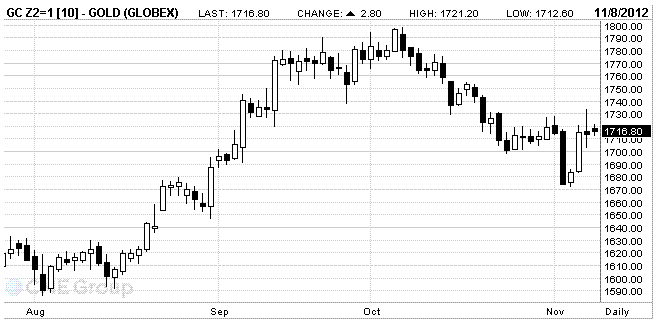 Цены на золото торговались сегодня вблизи уровня $ 1715 за унцию, поскольку фокус инвесторов сместился от переизбрания президента Барака Обамы до «фискального обрыва» в США, а также кризиса в еврозоне, что в конечном итоге вызвало снижение курса евро до двухмесячного минимума по отношению к доллару.
