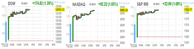 Оптимизм относительно решения проблемы “фискального обрыва” продолжает оказывать поддержку фондовым индексам. На этом фоне индекс S&P 500 демонстрирует максимальный дневной рост за последние два месяца.