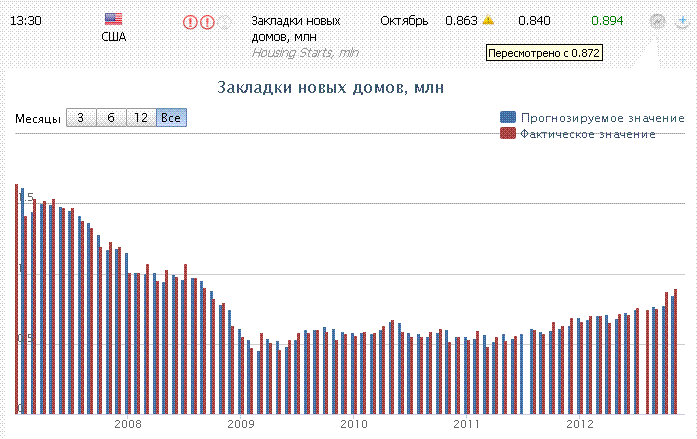 Не смотря на то, что разрешения на строительство и закладки новых домов по итогам октября оказались выше прогнозов, в целом блок данных по рынку жилья США, опубликованный сегодня, оказался смешанным, поскольку значения обоих показателей за сентябрь было пересмотрено в сторону повышения. Но есть один очень позитивный момент в сегодняшних данных: закладки новых домов продолжили расти и достигли максимального значения с сентября 2008 года, повысившись на 4% в месячном исчислении.