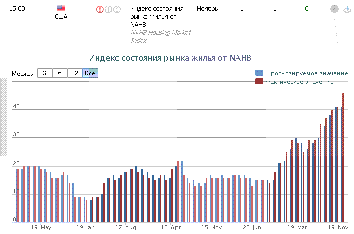 Отчет по закладкам новых домов стал еще одним сигналом улучшения ситуации на рынке жилья США. О улучшении ситуации также засвидетельствовал вчерашний отчет Национальной ассоциации домостроителей США (NAHB). Индекс состояния рынка жилья от NAHB по итогам ноября поднялся до уровня 46 пункта - максимального значения за последние 6 лет.