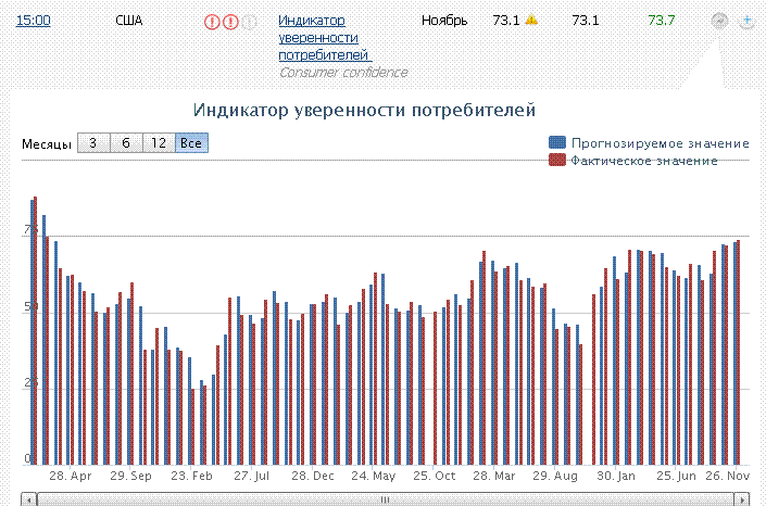 Ноябрьское значение индексы было на уровне 73,7 пункта против прогноза 73,1 пункта и пересмотренного в сторону повышения значения за октябрь на уровне 73,1 (пересмотрено с 72,0).