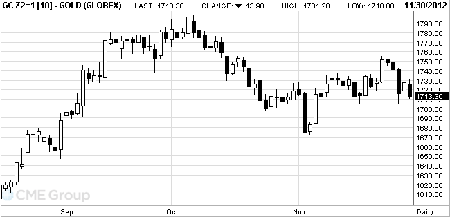 Стоимость декабрьского фьючерса на золото на COMEX сегодня упала до 1710.80 доллара за унцию.