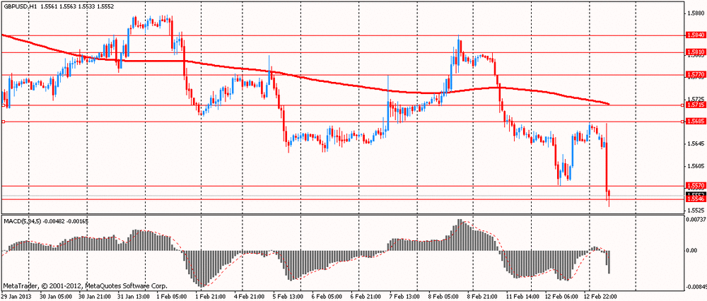 Пара GBP/USD обвалилась в ходе европейской сессии, отчёт Банка Англии спровоцировал падение пары от $1.5685 примерно на 150 пкт. до уровня 1.5533, что является 6-месячным минимумом.