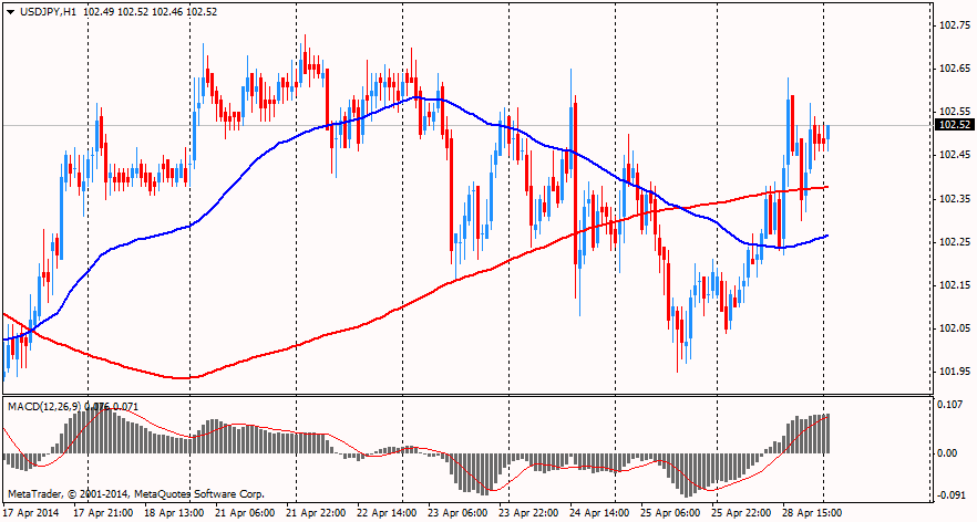 Курс иены снизился против доллара в ожидании результатов заседаний Банка Японии и Федеральной резервной системы, которые состоятся на этой неделе. Первым, 29-30 апреля, проведет свое заседание руководство ФРС. Экономисты ожидают, что Центральный банк вновь сократит ежемесячные покупки активов на $10 млрд. до $45 млрд. Вероятно, Федеральный резерв продолжит сокращение и полностью завершит программу QE к октябрю. Вторым (30 апреля) будет заседать ЦБ Японии. Более 70% экономистов считают, что Банк Японии к июлю этого года будет вынужден увеличить стимулирующие монетарные программы. Помимо этого аналитики ожидают от ЦБ обновленных прогнозов по инфляции и экономическому росту в стране. 29 апреля, а также 5-6 мая японские рынки будут закрыты в связи с праздниками.