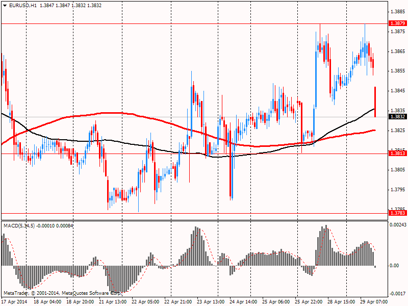 Курс EUR/USD резко снизился, отступив от максимума более чем на 50 пунктов, что было связано с выходом разочаровывающих данных по инфляции в Германии. Сейчас пара торгуется на уровне $1.3832. Ближайшая цель - $1.3813 (минимум 28 апреля)