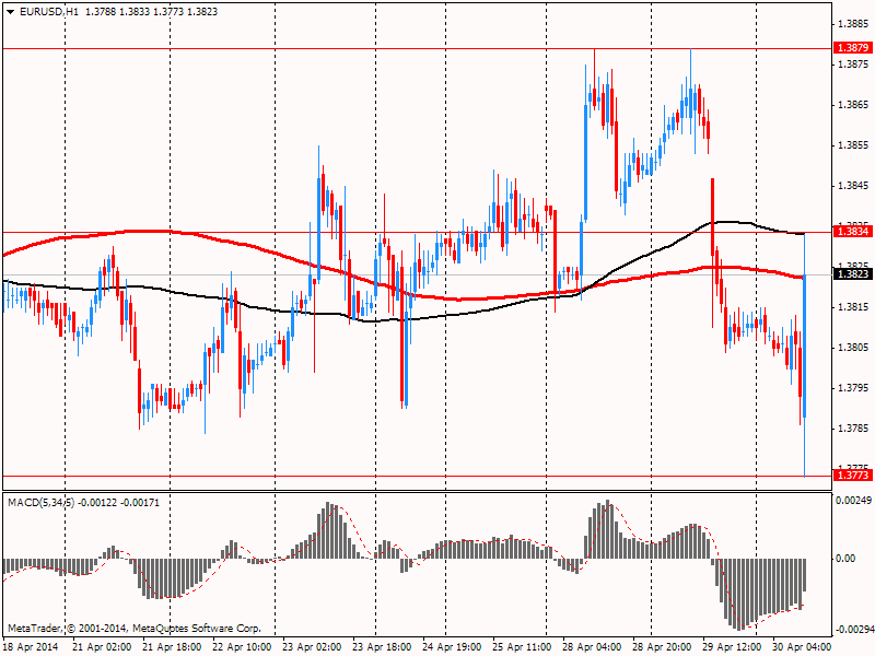 Курс EUR/USD резко снизился, установив новый сессионный минимум, но сразу же смог компенсировать все утраченные позиции. Динамика была вызвана выходом ИПЦ для еврозоны, который вырос, но не дотянул до прогнозов. Сейчас пара торгуется на $1.3823
