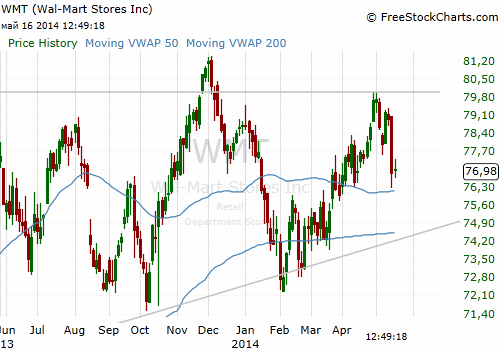 На текущий момент акции Wal-Mart Stores (WMT) торгуют по $76.98 (+0.20%).