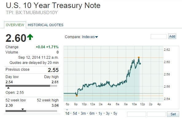 Доходность 10-летних казначейских облигаций США впервые с июля повысилась до уровня 2,60%