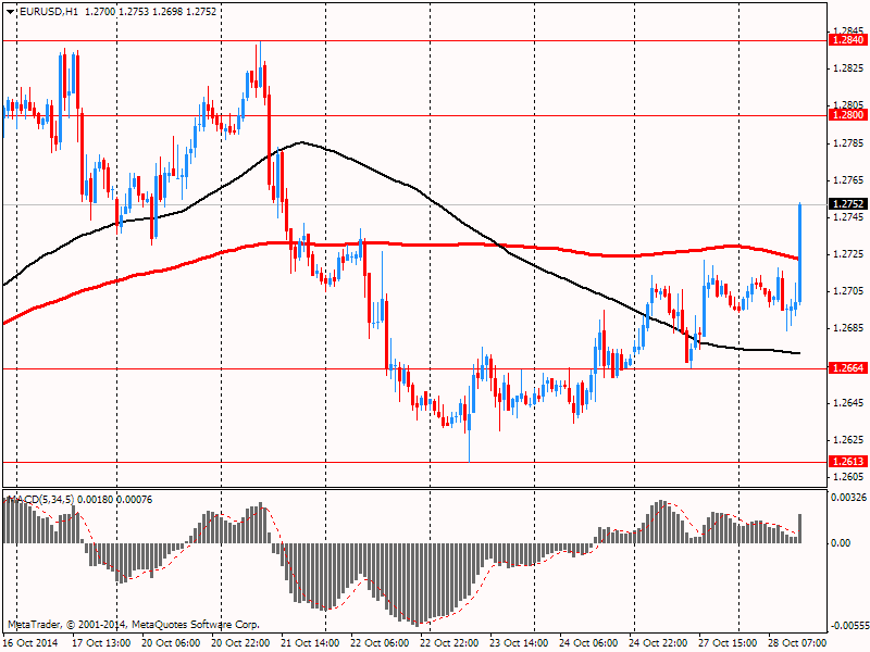 Курс EUR/USD резко вырос, достигнув при этом недельного максимума, что было связано с публикацией слабых американских данных по заказам. Сейчас пара торгуется на уровне $1.2752. Ближайшая цель - $1.2800 (психологический уровень)