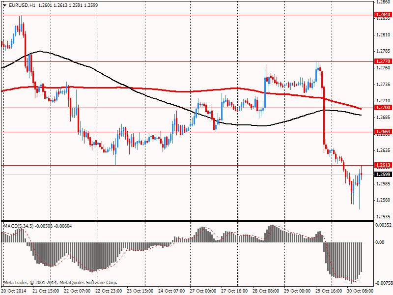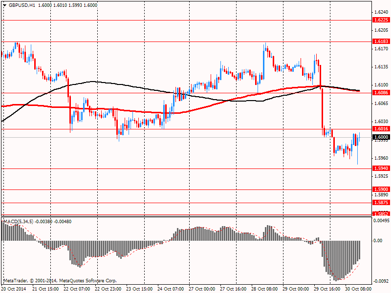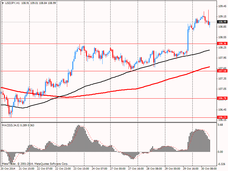 Доллар немного снизился против иены, но остался вблизи трехнедельного максимума. На ход торгов продолжает влиять вчерашнее решение ФРС. Напомним, Федеральная резервная система объявила об окончании программы покупок облигаций на фоне улучшения ситуации на рынке труда. ФРС предоставила довольно оптимистичную оценку перспектив рынка труда и экономики США. Помимо этого, Федеральный резерв заявил, что краткосрочные процентные ставки будут оставаться около нуля в течение "значительного периода времени". Однако инвесторы теперь с большим оптимизмом ждут повышения ставок. Согласно анализу, проведенному на фьючерсных площадках, на данный момент существует 75% вероятность сохранения сверхнизких ставок ФРС до октября 2015 года против 69% на прошлой неделе.