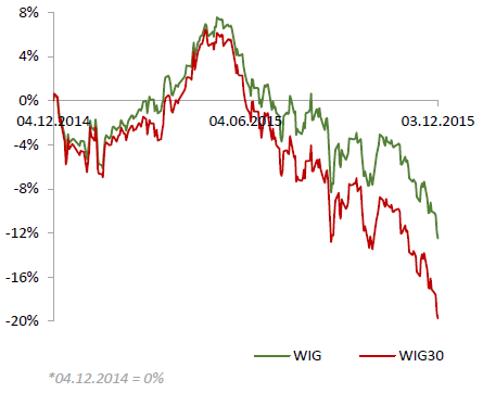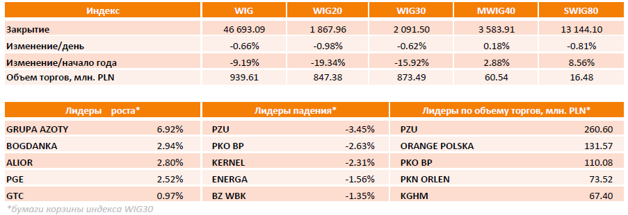 Индикатор компаний большой капитализации WIG30 потерял 0.62%. Лидером падения среди бумаг корзины индекса стали акции страховой компании PZU (WSE: PZU), которые обвалились на 3.45% на сообщении, что польские парламентарии возвратились к обсуждению вопроса о введении для страховых компаний налога на активы, подобно тому, который вводится для банков. За ними следуют акции банка PKO BP (WSE: PKO) и агрокомпании KERNEL (WSE: KER), которые потеряли 2.63% и 2.31% соответственно. Напротив, более всего прибавили в стоимости бумаги химпроизводителя GRUPA AZOTY (WSE: ATT) - 6.92%, что позволило им почти полностью отыграть потери предыдущих двух сессий.