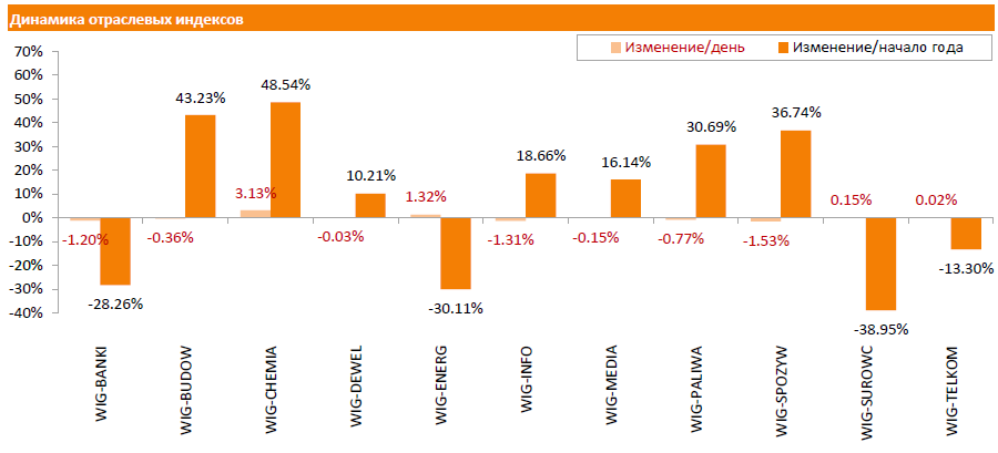 В четверг польский рынок акций закрылся снижением. Значение индекса широкого рынка WIG снизилось на 0.66%. В отраслевом разрезе сектора индекса показали смешанную динамику. При этом хуже всего пришлось акциям пищевой промышленности (-1.53%), тогда как лучший результат зафиксировали бумаги химкомпаний (+3.31%).