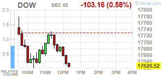 Почти все компоненты индекса DOW в минусе (21 из 30). Аутсайдером являются акции The Travelers Companies, Inc. (TRV, -1.28%). Больше остальных выросли акции Wal-Mart Stores Inc. (WMT. +1.86%).