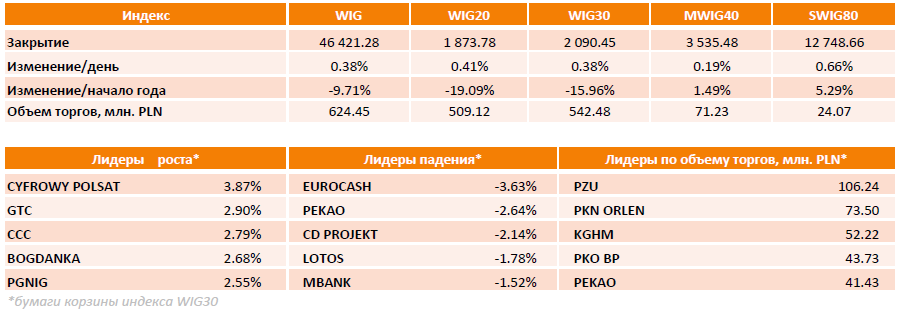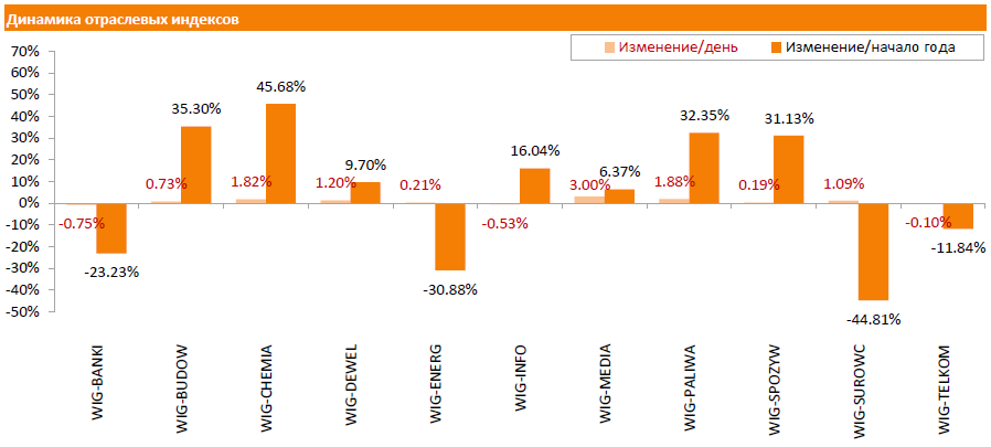 Во вторник польский рынок акций закрылся ростом. По итогам дня индикатор широкого рынка WIG прибавил 0.38%. В отраслевом разрезе, акции медиасектора (+3%) продемонстрировали наибольший рост, тогда как бумаги банковских учреждений (-0.75%) зафиксировали худший результат.