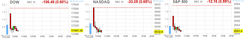 Основные фондовые индексы США демонстрируют умеренное снижение в ходе заключительной сессии 2015 года. Давление на индексы оказывает падение стоимости нефти, котировок технологических компаний и акций сектора потребительских товаров.