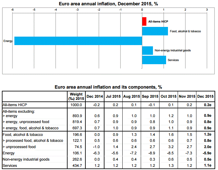 Предварительные данные, представленные Статистическим ведомством Евростат, показали, что потребительские цены в еврозоне выросли в декабре на 0,2%, так как и в предыдущем месяце. Эксперты ожидали, что цены увеличатся на 0,4%. Тем временем, базовый индекс потребительских цен, в котором не учитываются крайне волатильные составляющие, вырос в прошлом месяце на 0,9%, подтвердив прогнозы аналитиков. Напомним, в ноябре данный показатель также повысился на 0,9%.