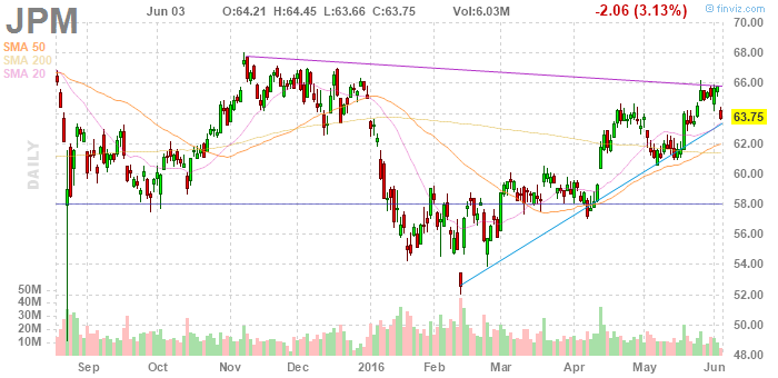 На текущий момент акции J.P. Morgan Chase & Co. (JPM) отируются по $63,75 (-3,13%)