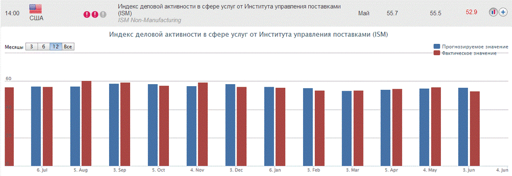 Индекс деловой активности в сфере услуг США, рассчитываемый Институтом управления поставками (ISM), заметно ухудшился в мае, достигнув уровня 52,9 по сравнению с 55,7 в предыдущем месяце. Согласно прогнозу, значение показателя должно было снизится до 55,5.
