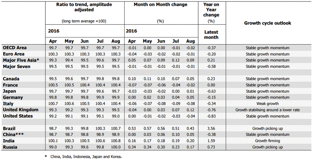 Ежемесячные опережающие индикаторы ОЭСР показали, что экономический импульс по-прежнему устойчивый в крупных промышленно развитых стран, в то время как в рост Великобритании замедлился после того, как в июне страна проголосовала за выход из ЕС.