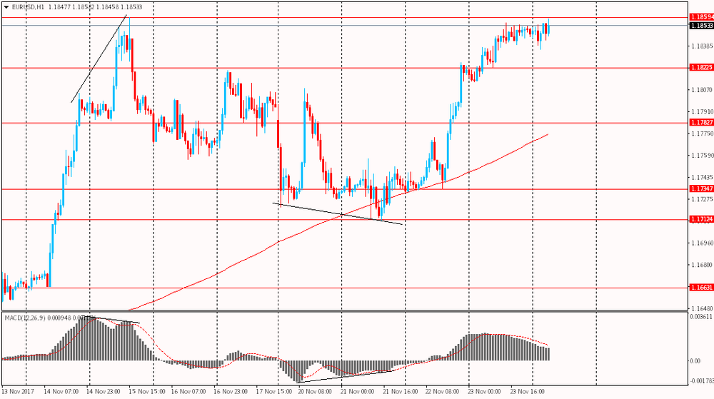 EUR/USD: в ходе азиатской сессии пара выросла к $1.1855 и продолжает вчерашний рост. Глобально евро торгуется в рамках устойчивого восходящего тренда от 7 ноября. По этой причине стоит и далее присматриваться к покупкам пары на коррекциях. Ближайшей поддержкой выступает уровень $1.1825 (минимум европейской сессии 23 ноября)