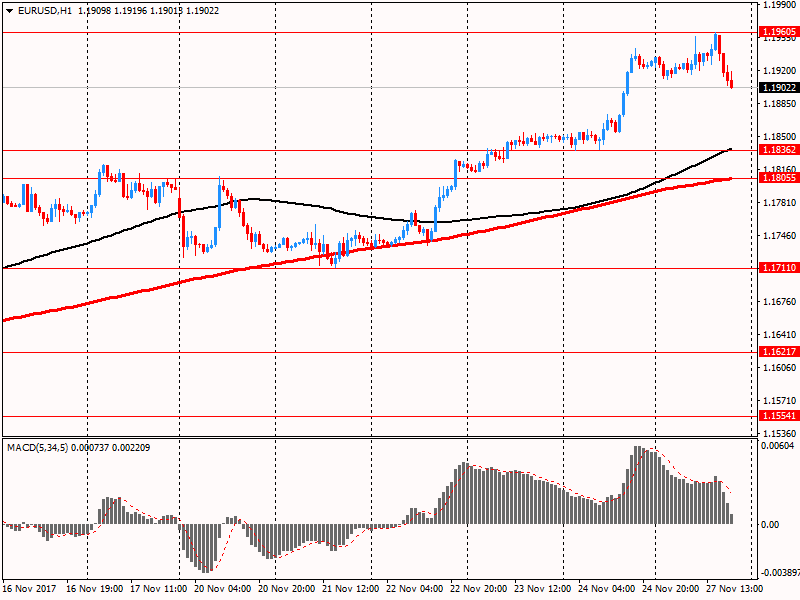 Пара EUR/USD продолжает снижаться, обновляя минимум сессии. Катализатором этому является новая волна укрепления американской валюты. Сейчас пара EUR/USD торгуется на $1.1902, с понижением на 0,24%. Ближайшая поддержка - $1.1836 (минимум 24 ноября)