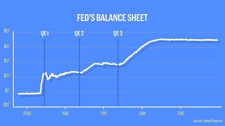 Целевая ставка по фондам ФРС - процентная ставка, взимаемая коммерческими банками с других банков, которые заимствуют деньги - была уже близка к нулю. Но центральный банк США предпринял беспрецедентные шаги, снизив процентную ставку еще больше. ФРС также запустила программу количественного смягчения (QE), в конечном счете купив государственные облигации и ипотечные ценные бумаги на триллионы долларов.