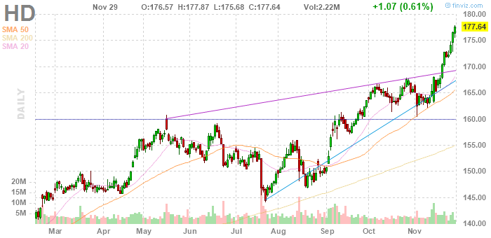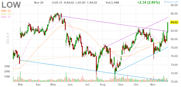 На текущий момент акции Home Depot (HD) котируются по $177,64 (+0,61%), а Lowe's (LOW) - по $84,02 (+2,86%)