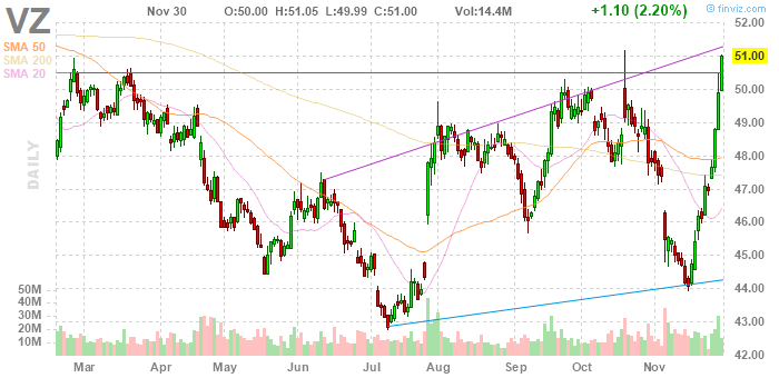 На текущий момент акции Verizon (VZ) котируются по $51,00 (+2,20%)