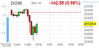Большинство компонентов индекса DOW в минусе (27 из 30). Лидер роста - Merck & Co., Inc. (MRK, +0.20%). Аутсайдер - General Electric Company (GE, -2.00%).