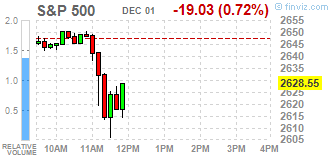 Почти все сектора S&P в минусе. Больше всего вырос сектор сырьевых материалов (+0.2%). Наибольшее снижение показывает сектор промышленных товаров (-1.6%).