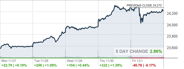 В четверг фондовые рынки США заметно выросли, причем промышленный индекс Доу-Джонса впервые в истории пробил отметку 24 000 на фоне ожиданий того, что план снижения налогов президента Дональда Трампа может получить достаточную поддержку для имплементации. Кроме того, поддержку индекса оказали данные по США. Как стало известно, число американцев, подавших заявки на получение новых пособий по безработице, упало на прошлой неделе, подтверждая общую силу рынка труда. Первичные обращения за пособиями по безработице, датчик увольнений в США, снизились на 2000 до 238 000 с учетом сезонных колебаний на неделе, закончившейся 25 ноября, сообщило Министерство труда. Экономисты ожидали 240 000 новых заявок. Вместе с тем, после достижения максимума с марта 2011 года в октябре, индекс менеджеров по закупкам Чикаго упал в ноябре на фоне замедления новых заказов. Индекс PMI упал с 66,2 до 63,9, но был лучше ожиданий 63,0.