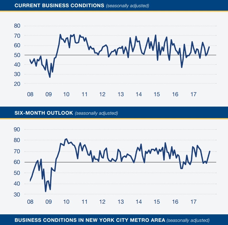 Согласно представленным данным, индекс, оценивающий экономические условия в секторах производства и услуг для компаний, зарегистрированных в Нью-Йорке, вырос в ноябре до 58,1 пункта с 51,6 пункта в октябре. Последнее значение оказалось самым высоким с июля (тогда индекс составлял 62,8 пункта). Прогнозировалось, что индекс поднимется лишь до 54,0 пункта. Напомним, значение выше 50 пунктов говорит о расширении активности. Вместе с тем, индекс, отражающий экономические условия через 6 месяцев, улучшился до 69,7 пункта против 62,6 пункта в октябре.