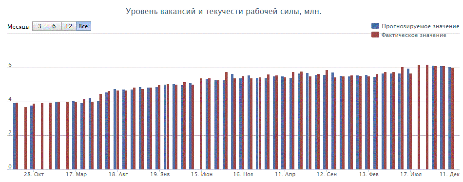 Обзор вакансий и текучести рабочей силы (JOLTS), опубликованный Бюро статистики труда США, показал, что в октябре число вакансий снизилось до 5,996 млн. Между тем, показатель за сентябрь был пересмотрен в сторону повышение - до 6,177 млн. с 6,093 млн. Аналитики ожидали, что число вакансий уменьшится до 6,030 млн. Уровень вакансий составил 3,9 процента, уменьшившись на 0,1 процента относительно сентября. Количество вакансий сократилось в частном секторе, и мало изменилось в правительственном сегменте. Что касается отраслей, число вакансий выросло в секторе питания и проживания (+94 000), сфере строительства (+48 000), и сфере недвижимости, аренды и лизинга (+40 000). Сокращение числа вакансий было зафиксировано в секторе оптовой торговли (-90 000), сфере финансов и страхования (-47 000), сегменте информации (-32 000), и секторе производства товаров недлительного пользования (-26 000).