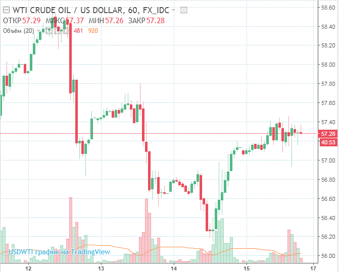 В настоящее время нефть марки West Texas Intermediate торгуется на уровне $57.28 (+0.26%) по сравнению с $57.29 до публикации данных.