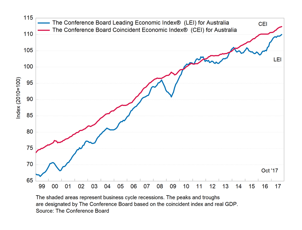 Результаты исследований, опубликованные Conference Board, показали: по итогам октября ведущий экономический индекс (LEI) для Австралии вырос на 0,3 процента, и составил 110,0 пункта (2010=100). Напомним, индекс зафиксировал увеличение на 0,2 процента в сентябре и нулевое изменение в августе. В течение шести месяцев (с апреля по октябрь 2017 года) показатель вырос на 0,6 процента после того, как увеличился на 0,5 процента за предыдущий шестимесячный период (с марта по сентябрь 2017 года).