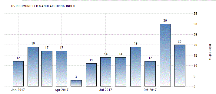 Согласно отчету, декабрьский индекс производственной активности снизился до +20 пунктов против +30 пунктов в ноябре. Прогнозировалось, что показатель опустится до +22 пункта. Напомним, значение выше 0 указывает на улучшение условий в производственном секторе, в то время как ниже 0 указывает на ухудшение условий. Данные берутся из опроса около 100 производителей в районе Ричмонда.