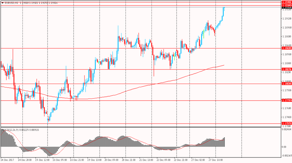 В начале предпоследней торговой сессии 2017 года основными тенденциями на рынках продолжают оставаться ослабление доллара и рост цен на сырьевом рынке. Повышение цен на сырье позитивно отражается на курсах сырьевых валют. И все это происходит в условиях сниженных объемов торгов. Слабость доллара по-прежнему во многом обусловлена пересмотром участниками рынков своих оценок относительно влияния принятого на прошлой неделе закона о налоговой реформе на американскую экономику. Дополнительное негативное давление на американскую валюту также оказало снижение уверенности потребителей, о чем накануне заявили в Conference Board. Последнее отчасти как раз и было обусловлено переоценкой ожидаемого влияния налоговой реформы.