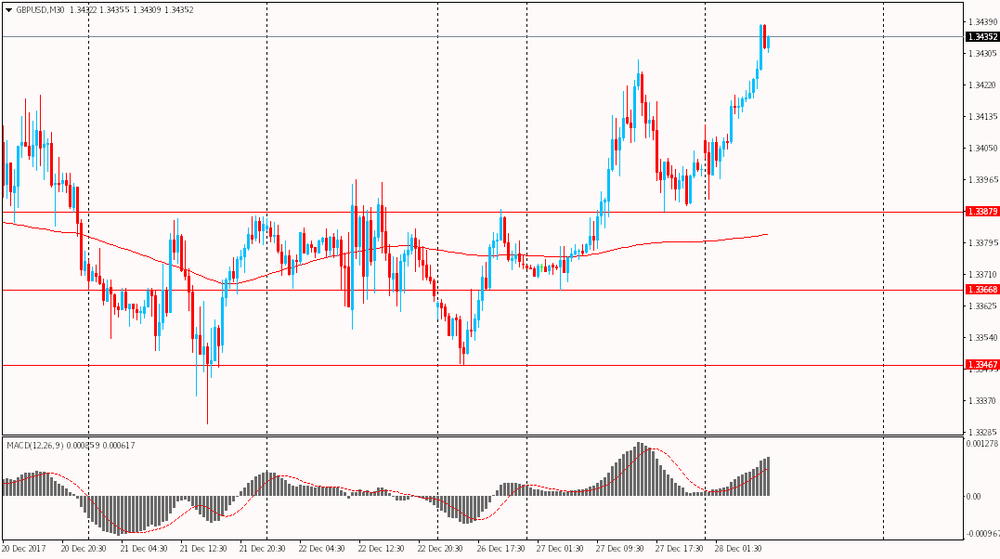 GBP/USD: в ходе азиатской сессии пара выросла к $1.3435. Глобально пара остается в восходящем канале от 3 ноября. В этой ситуации наиболее уместным будет присматриваться к покупкам пары на коррекциях. Ближайшая поддержка находится на уровне $1.3390 (минимум американской сессии 27 декабря)