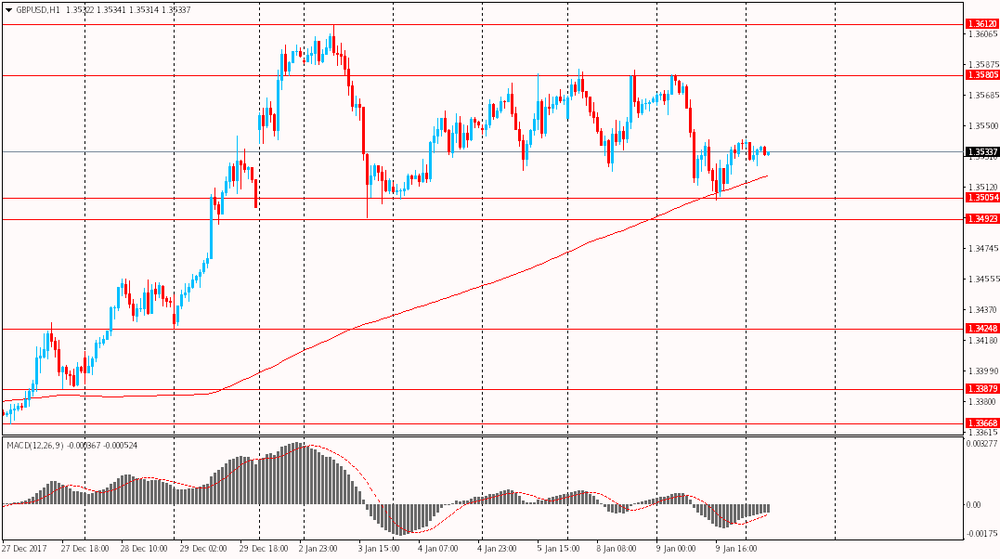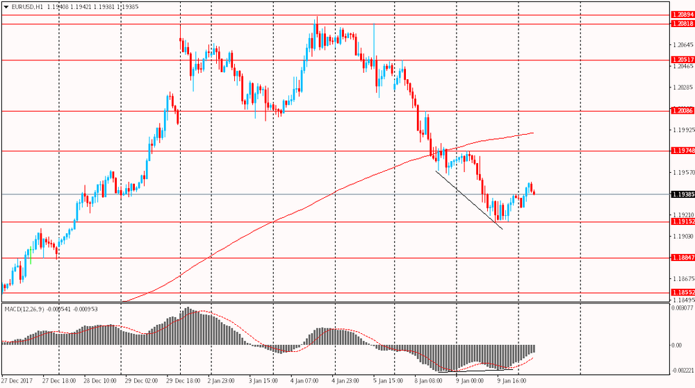 EUR/USD: в ходе азиатской сессии пара торговалась в диапазоне $1.1925-55. Несмотря на 3-х дневное снижение, пара продолжает оставаться в общем восходящем тренде и торгуется в рамках восходящего канала от 7 ноября. Более того, на часовом графике сформировалась бычья дивергенция по индикатору MACD, что сигнализирует о росте евро. В данной ситуации стоит присматриваться к покупкам пары на окончание коррекционного снижения. Ближайшая поддержка находится на уровне $1.1915 (минимум 9 января)