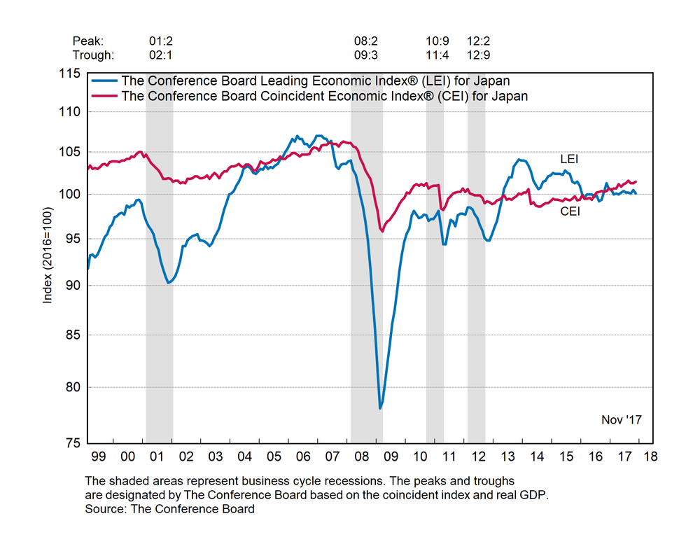 Результаты исследований, опубликованные Conference Board, показали: по итогам ноября ведущий экономический индекс (LEI) для Японии снизился на 0,4 процента, и составил 100,1 пункта (2010=100). Напомним, индекс зафиксировал прирост на 0,4 процента в октябре и падение на 0,1 процента в сентябре. В течение шести месяцев (с мая по ноябрь 2017 года) показатель снизился на 0,1 процента после того, как повысился на 0,5 процента за предыдущий шестимесячный период (с апреля по октябрь 2017 года).