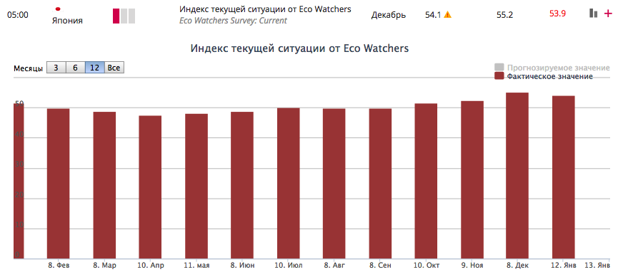 Согласно опубликованным сегодня правительственным данным Японии, индекс текущей ситуации в экономике от специализированных наблюдателей (Eco Watchers) снизился в декабре к уровню 53.9, тогда как срединный прогноз экономистов предполагал рост к 55.2. Таким образом показатель неожиданно снизился после значения 54.1 в ноябре. Напомним, что это значение было пересмотрено с уровня 55.1. Индекс перспективы развития событий от Eco Watchers также снизился с 53.8 в ноябре к 52.7 в декабре.
