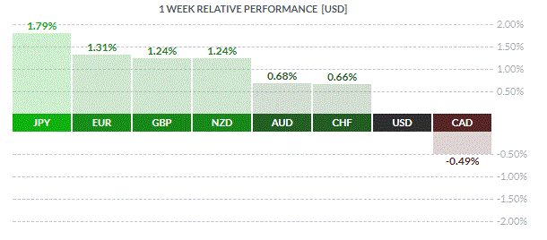 По итогам недели почти все основные валюты продемонстрировали повышение. Наибольший прирост по отношению к доллару США показала японская иена (+1,79%). Меньшее повышение зафиксировали евро (+1,31%), британский фунт (+1,24%), новозеландский доллар (+1,24%), австралийский доллар (+0,68%), и швейцарский франк (+0,66%). Падение показал только канадский доллар (-0,49%).