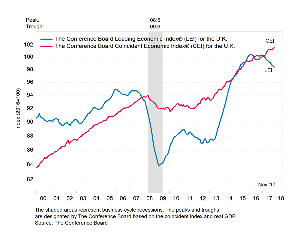 Результаты исследований, опубликованные Conference Board, показали: по итогам ноября ведущий экономический индекс (LEI) для Британии снизился на 0,2 процента, и составил 98,4 пункта (2010=100). Напомним, индекс зафиксировал падение на 0,1 процента в октябре и снижение на 0,3 процента в сентябре. В течение шести месяцев (с мая по ноябрь 2017 года) показатель снизился на 1,1 процента после того, как опустился на 1,0 процента за предыдущий шестимесячный период (с апреля по октябрь 2017 года).